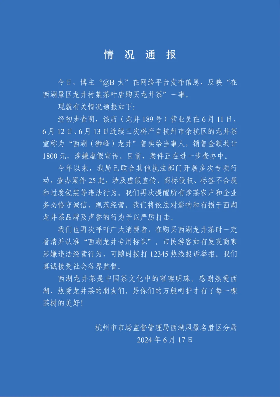 6月17日,杭州市市场监督管理局西湖风景名胜区分局就博主“@B太”在网络平台发布信息,反映“在西湖景区龙井村某茶叶店购买龙井茶”一事发布情况通报。经初步查明,该店(龙井189号)营业员在6月11日、6月12日、6月13日连续三次将产自杭州市余杭区的龙井茶宣称为“西湖(狮峰)龙井”售卖给当事人,销售金额共计1800元,涉嫌虚假宣传。目前,案件正在进一步查办中。