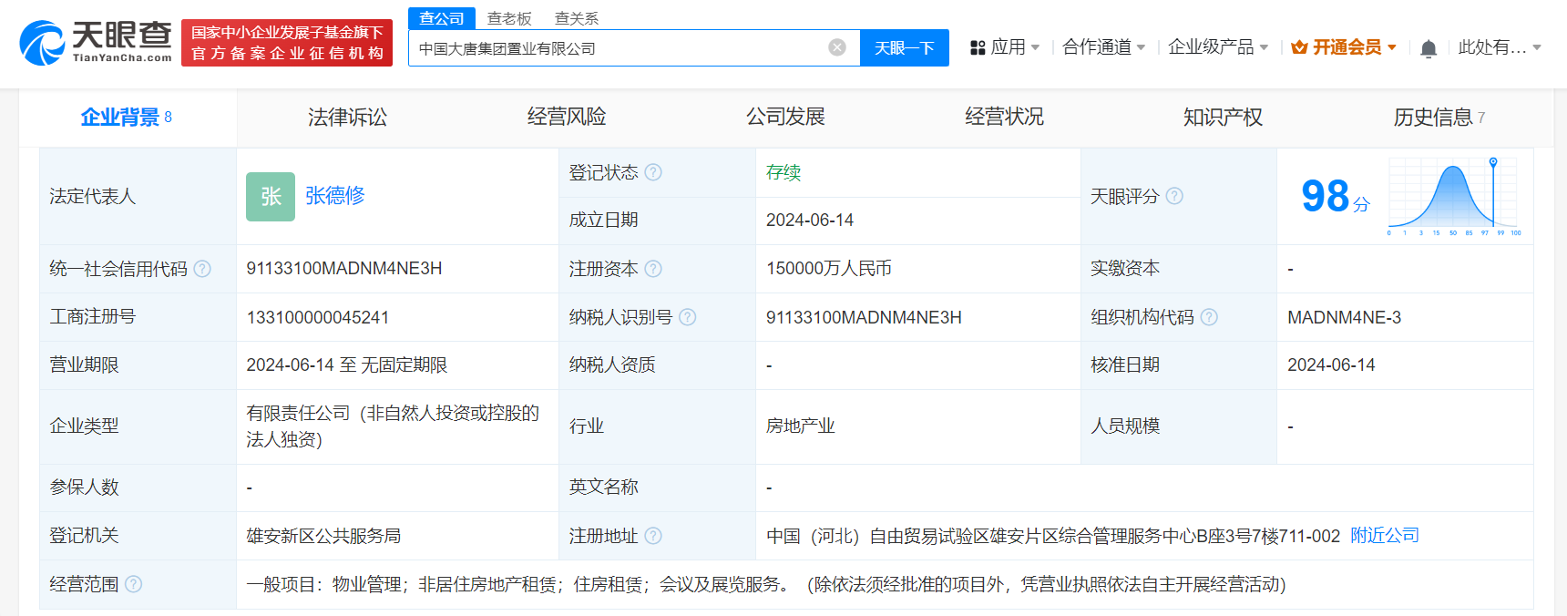天眼查App显示,近日,中国大唐集团置业有限公司成立,法定代表人为张德修,注册资本15亿人民币,经营范围为物业管理、非居住房地产租赁、住房租赁、会议及展览服务。股东信息显示,该公司由中国大唐集团有限公司全资持股。
