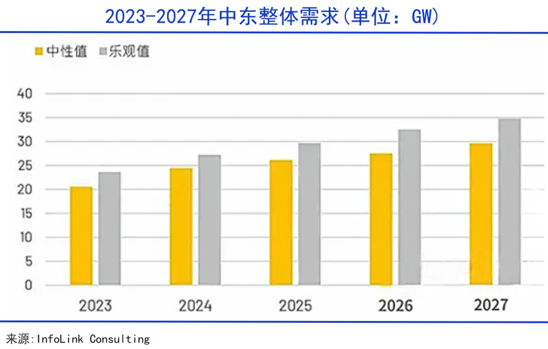 长期来看,中东光伏市场的发展势头远优于国内。InfoLink预测,中东的需求量将在2027年达到29-35GW。