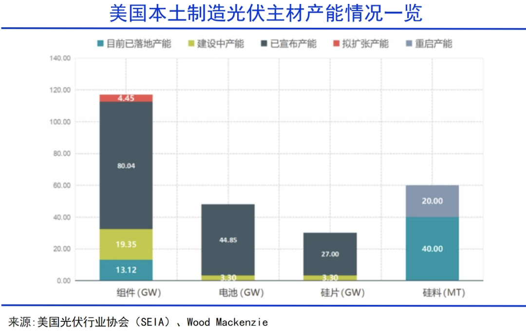 借助政府补贴,美国本土光伏产能急速扩张,组件产能在2022年底仅8GW,2023年增长超60%,达到13GW以上,还有近20GW在建,加上已宣布的80GW以及拟扩建的4.45GW,仅组件到2026 年就可能达到120GW,接近目前的10倍。