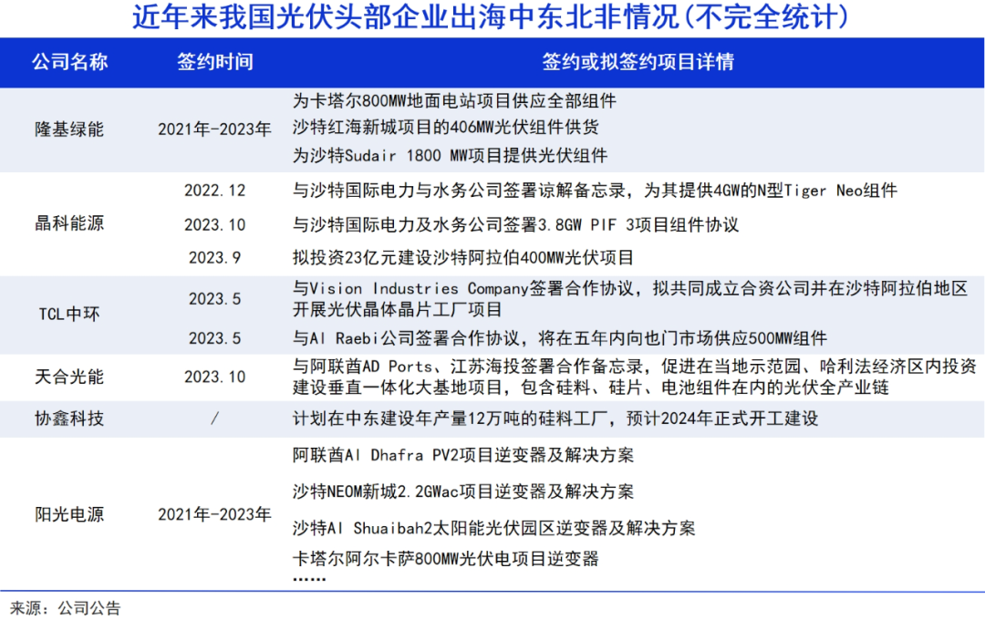 此外,隆基、晶科等都已在中东地区签下了数个供应大单,振江股份等零部件供应商也谋划在当地成立全资子公司,逆变器龙头正泰电器、阳光电源在中东市场也有所斩获。