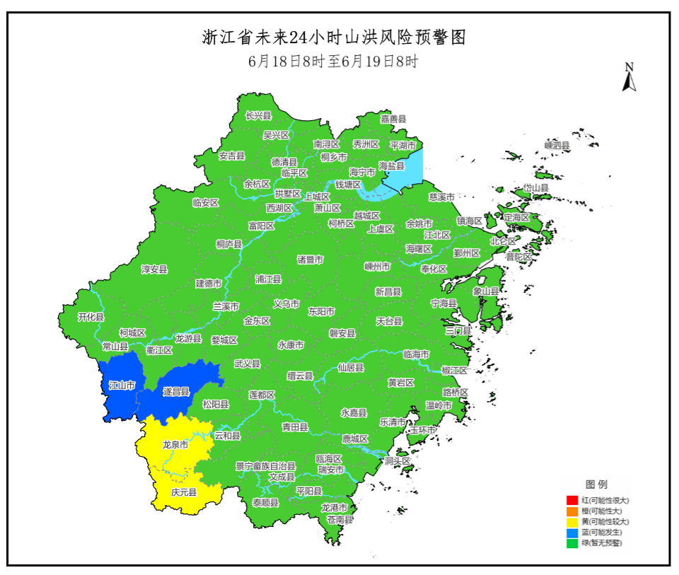 浙江水利官微消息,浙江省水利厅、省气象局6月18日7时7分联合发布山洪灾害预警:根据省气象台未来降雨预报,预计6月18日8时至6月19日8时,庆元县、龙泉市发生山洪灾害可能性较大(黄色预警),江山市、遂昌县可能发生山洪灾害(蓝色预警)。