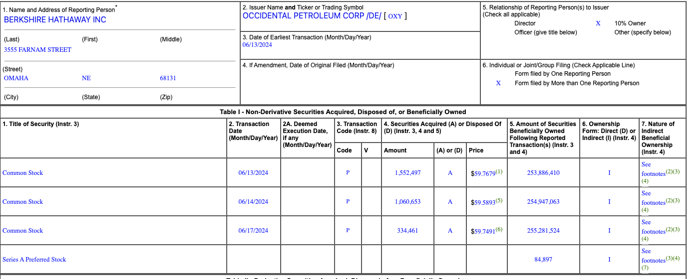 伯克希尔哈撒韦当地时间6月17日向美国证券交易委员会提交的文件显示,该公司在6月13日至6月17日共增持了2947611股西方石油(Occidental Petroleum)普通股,增持后伯克希尔哈撒韦共持有2.55亿股西方石油普通股。