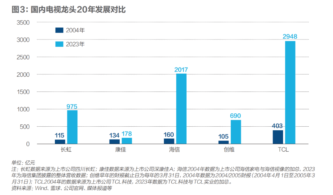 有了面板这个第二增长曲线和光伏这个第三增长曲线,TCL显著拉开了与昔日电视同行的差距。2004年,TCL营收403亿元,海信、创维、康佳、长虹的营收都在百亿规模。到2023年,TCL营收逼近3000亿元,海信营收首次突破2000亿元为2017亿元,其他电视企业营收都不过千亿元。