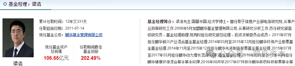 官方资料显示,梁浩是经济学博士,曾任职于信息产业部电信研究院,从事产业政策研究工作。2008年5月他正式加盟鹏华基金,历任研究部高级研究员、基金经理助理、副总经理、董事总经理。现担任公司副总裁,投资决策委员会成员。