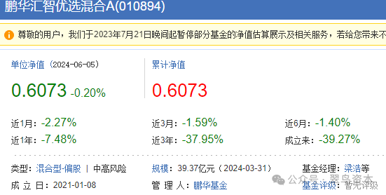 据了解,梁浩旗下有一只“鹏华汇智优选混合”的产品,规模在其产品线中居前,最新净值在0.60元附近徘徊,如下图所示: