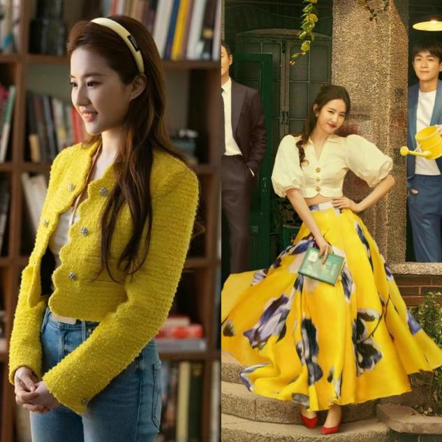 不仅如此,刘亦菲所饰演的主人公,更是多次出现多巴胺穿搭:有时是黄色小香风外套,搭配白色吊带、紧身牛仔裤;有时是白色泡泡袖衬衣,搭配黄色蓬松长裙。