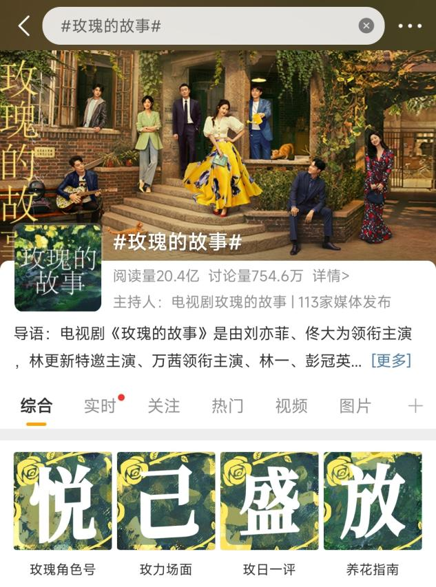 比如在微博上,词条“玫瑰的故事”,累计阅读量已突破20亿,讨论量突破750万;抖音上,话题“玫瑰的故事”,累计播放超130亿次,官方账号粉丝数破60万。