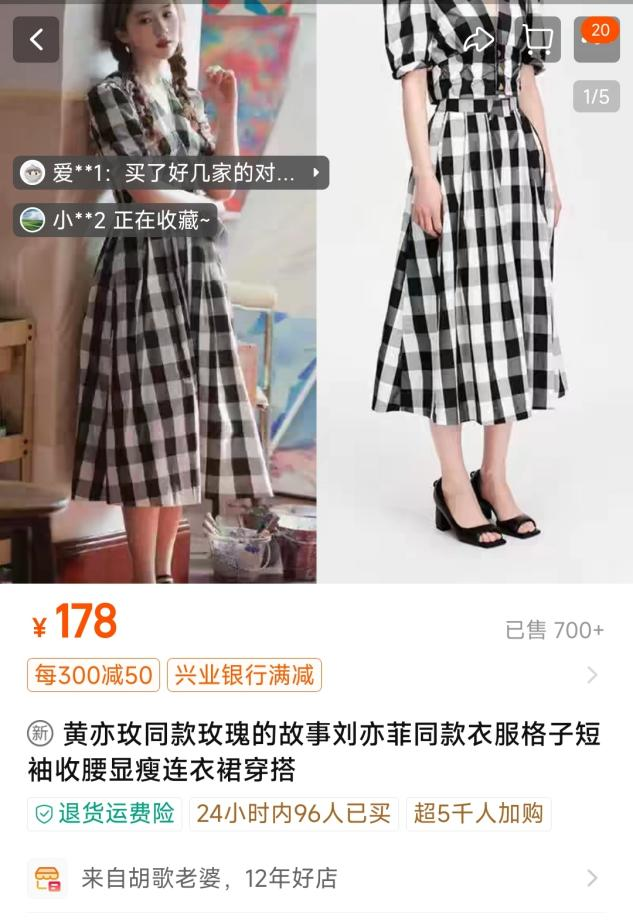 比如,刘亦菲剧中所穿的格子连衣裙,在淘宝上成为顶流商品,销量最好的同款,一件售价178元,已售超过700件,5000多人加入购物车;值得注意的是,这家店铺名叫“胡歌老婆”,属实将追星玩明白了。