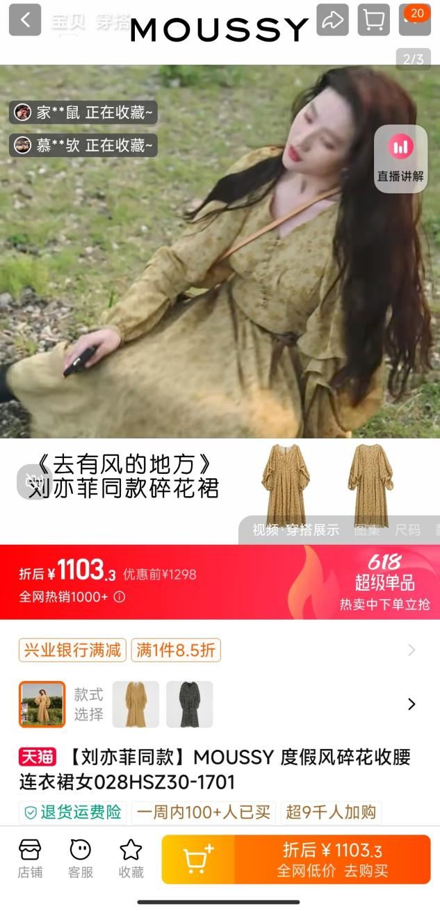 比如,Moussy天猫旗舰店内,一条度假风碎花连衣裙,打上了剧中黄亦玫同款标签,折后价1100元左右,一周内超过100人购买,另有9000多人加入购物车。