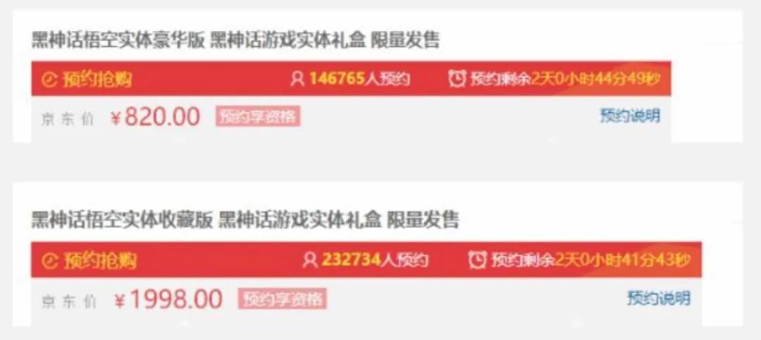 在数字版之外,实体豪华版售价820元,包括了游戏兑换码、收藏铁盒以及黄铜紧箍等游戏周边,实体收藏版则售价1998元,在实体豪华版的基础上额外包含了“天命人”手办和其他周边产品。