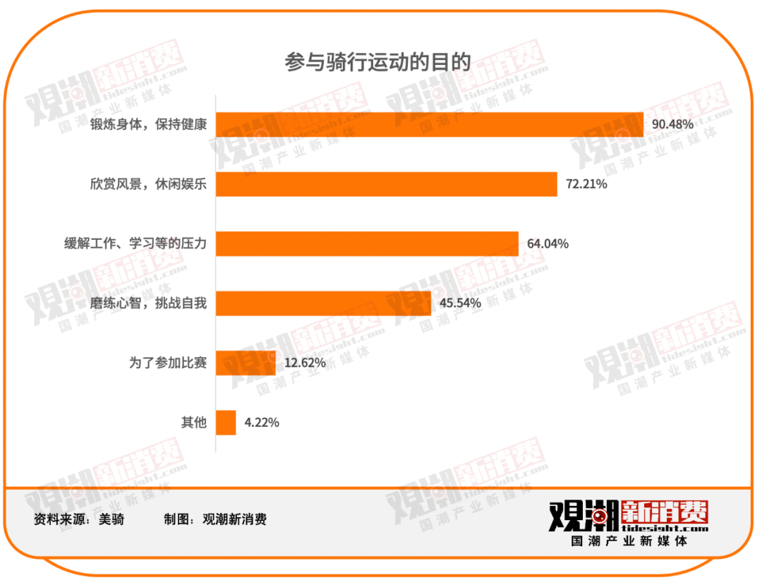 根据美骑网发布的《2022年中国自行车行业调查报告》,人们参与骑行的前三大理由分别是:锻炼身体、休闲娱乐和缓解压力。人们不仅将自行车作为运动健身的方式,情绪的放松和压力的纾解在参与骑行的人们眼中同样重要。