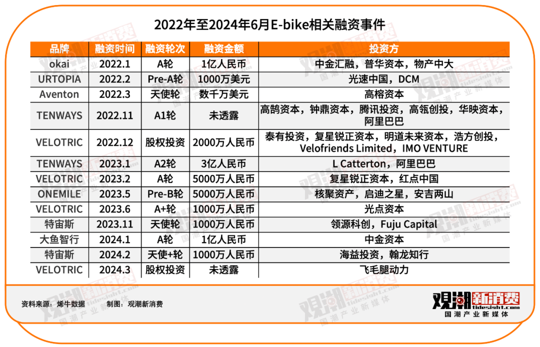 在资本市场,E-bike相关融资消息不断传出。观潮新消费根据公开数据不完全统计,在资本寒冬的2023年也有4个E-bike品牌完成融资,2024年截至6月也产生了3起E-bike相关投融资事件。