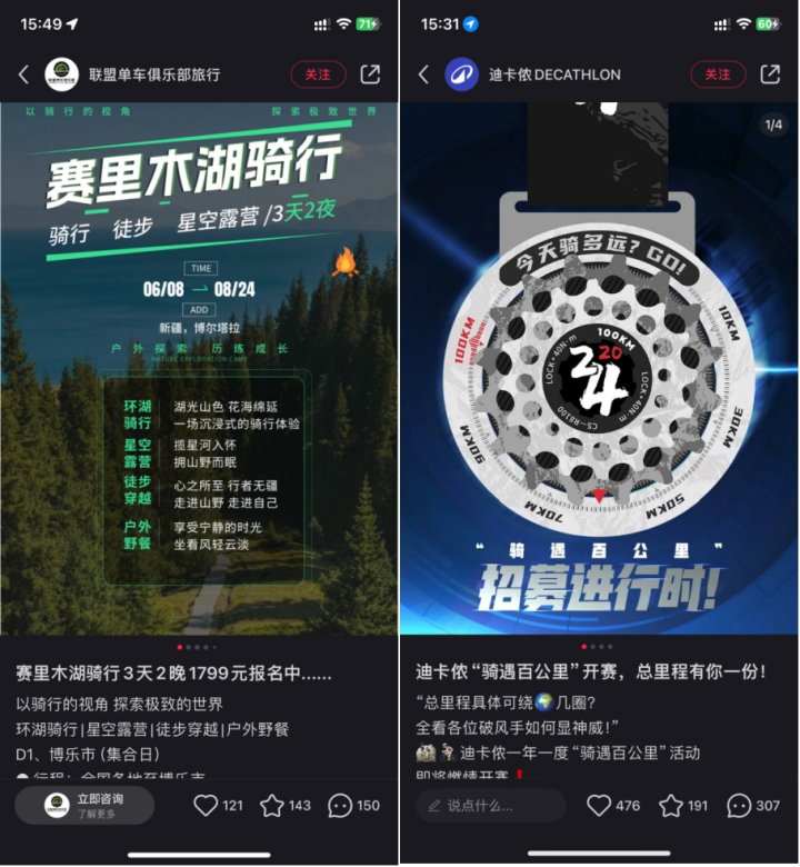 骑行+旅游的模式在小红书上十分常见。例如赛里木湖的骑行计划,便是将旅游项目与现在热门的徒步、骑行、露营相结合,提供全套装备和后勤保障,让自由时间更为充裕的骑行爱好者远离城市,领略大自然。