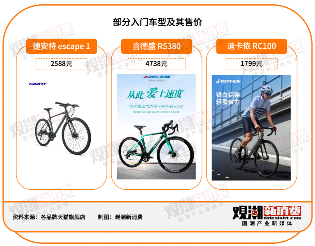 价格带分布如上图所示,整车的价格从百元至十几万元不等。对于新手来说,目前较为流行的入门车型包括捷安特escape 1、喜德盛RS380、迪卡侬RC100等,这几款车型的价格在1799元至4738元区间,千元也是新手更容易接受的心理价位。