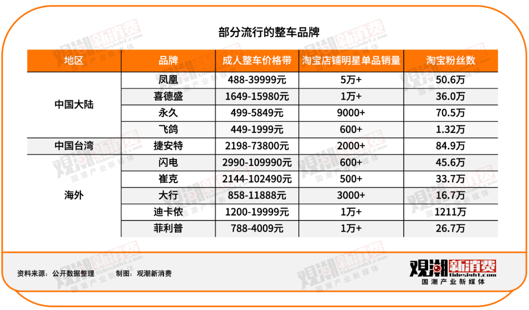 消费者的不同搭配选择,也注定了骑行细分品类的市场格局。目前,自行车整车的品牌格局较稳定,以小布、大行为代表的海外品牌占据高端市场,捷安特、美利达以超高渗透率占中高端市场的大半壁江山,喜德盛则以高性价比主攻大众市场。