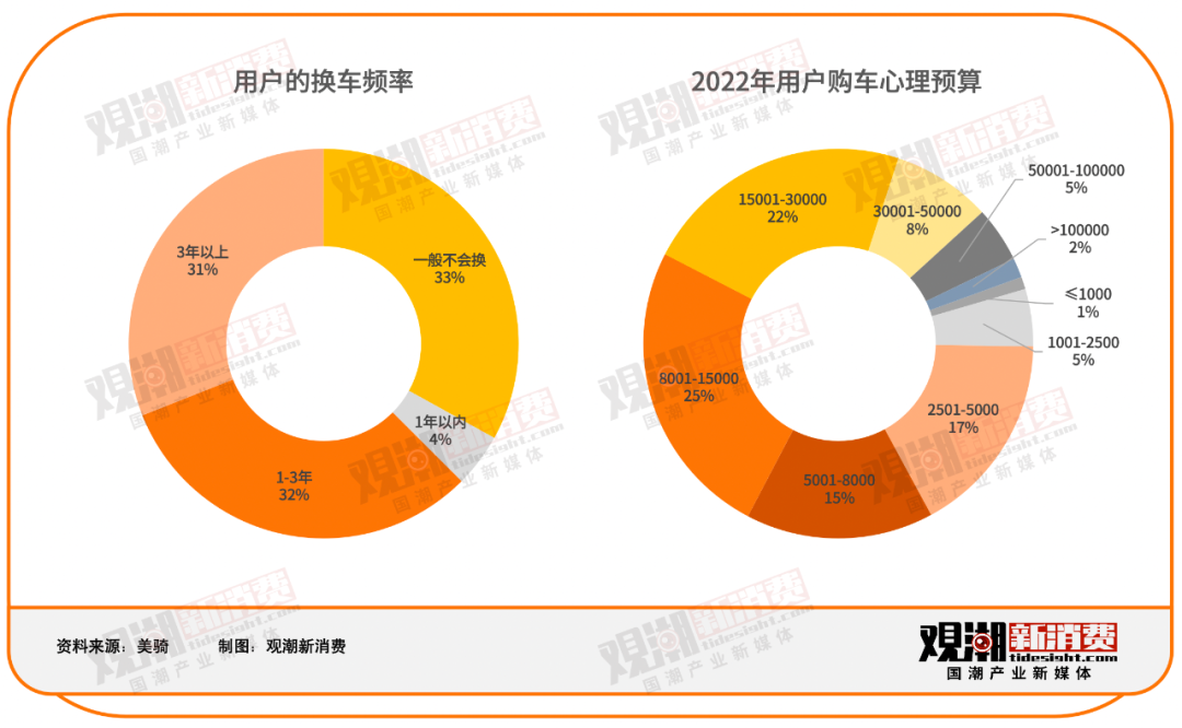 根据《2022年中国自行车行业调查报告》,在整体调研人数中有67%以上的人拥有超过两辆车,31.52%的人会选择在骑行1-3年时更换整车。而从购车心理预算来看,用户购车预算依然是8001-15000元区间占比最大(24.92%),其次为15001-30000元区间(22.4%)。