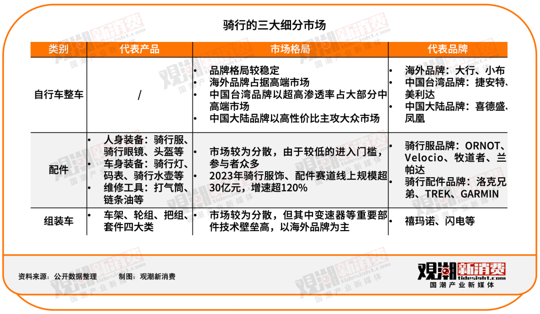 另一边,需求大、门槛低的骑行装备则呈现出不同的发展态势。数据显示,2023年骑行服饰、配件赛道仅线上规模就有30多亿,增速超120%,十分利好新玩家入场。