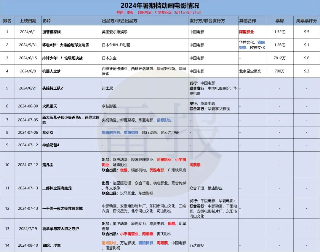 根据灯塔专业版数据,截至目前,暑期档已有14部动画电影首映或定档,其中有四部影片已上映,分别为《加菲猫家族》《哆啦A梦:大雄的地球交响乐》《排球少年!!垃圾场决战》《机器人之梦》。