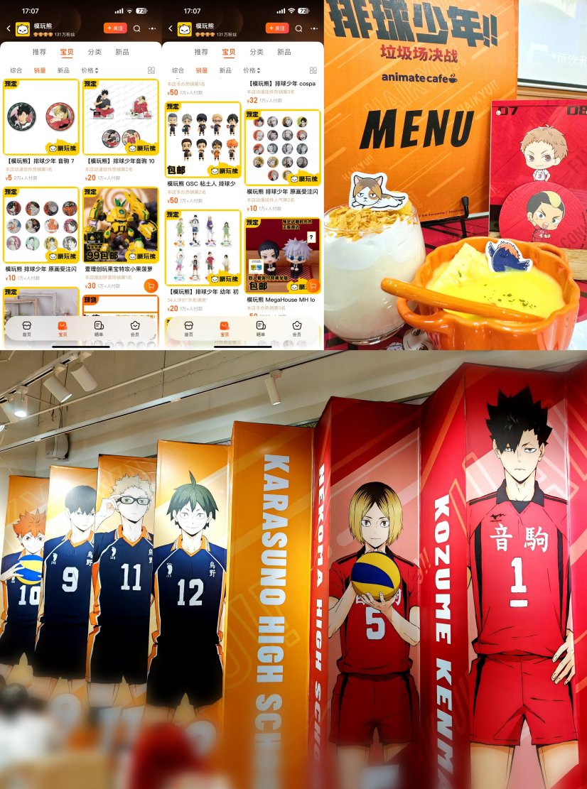 《排球少年》IP周边衍生品的热度也一直居高不下,如今已经成为国内每家“谷子店”的常客,不论在线上还是线下店铺都拥有不俗销量;animate cafe上海旗舰店的《排球少年!!垃圾场决战》主题快闪餐厅内,前来打卡的粉丝络绎不绝。