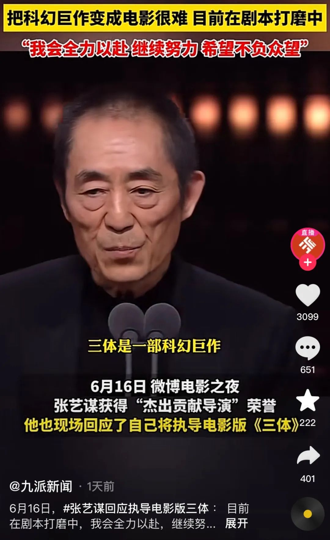 哦莫,听了这段张艺谋答记者问“拍一个科幻题材需要些什么”,怀疑他还没开始看《三体》。老谋子对科幻的理解,感觉还停留在硬糖君小学写作文《畅想2030年人类发展》什么的。