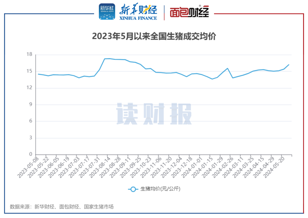 根据国家生猪市场披露的数据,全国生猪成交均价进入2024年以来相对稳定。2024年5月,生猪成交均价较去年同期出现较明显上升。