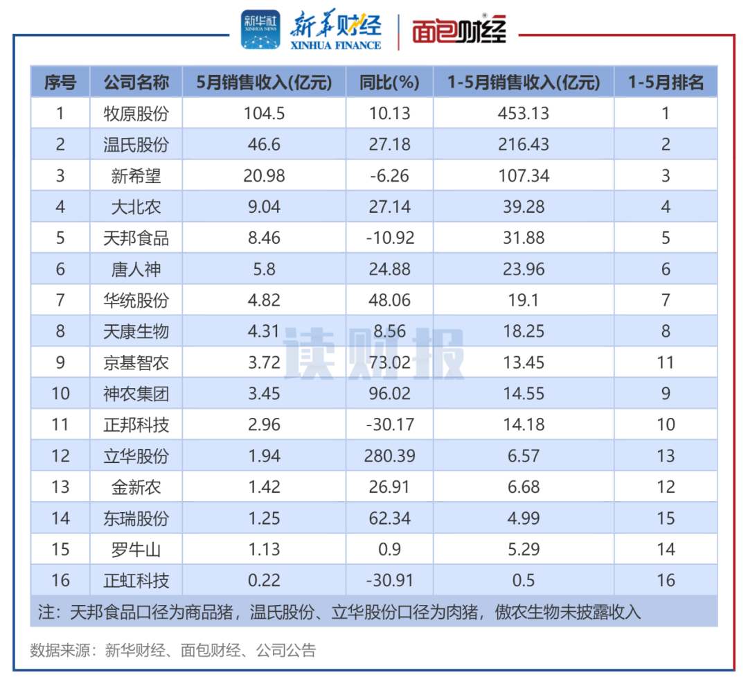 近期,生猪养殖企业5月的销售数据陆续披露。新华财经和面包财经研究员在剔除部分数据披露不全的上市猪企后,以沪、深两大交易所主要上市生猪养殖企业为样本,分别统计其生猪销售收入、销量。