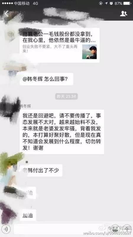 根据截图,韩冬辉称事态发展不太对,越来越始料不及,希望大家不要再转发。“本来就是老婆发发牢骚,背着我发的,本打算好聚好散,现在真不知道发展到什么程度,切勿再转发。”