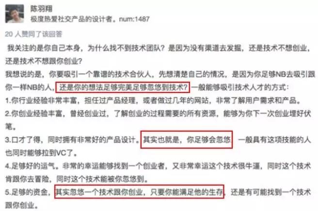 有趣的是,陈羽翔曾在知乎发文,回答“如何寻找技术合伙人”的问题,并且反复提及“忽悠”两个字,声称“只要有足够的资金,满足他的生存,还是能忽悠他过来的”,以下为回答全文: