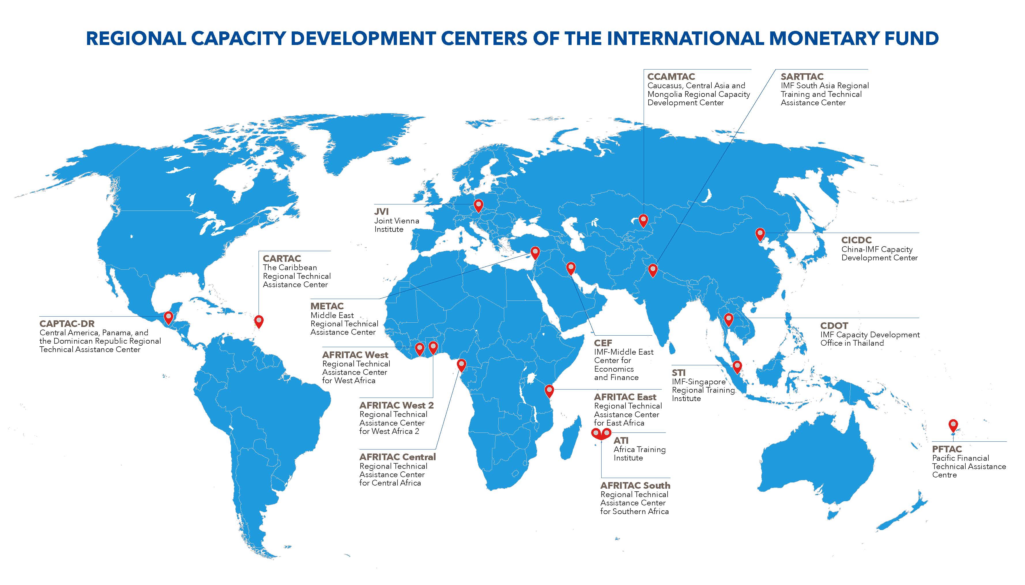 根据IMF网站介绍,截至2020年1月,IMF共有17个区域中心,大部分位于发展中国家。2020年1月至今,IMF未再更新关于区域中心的信息。