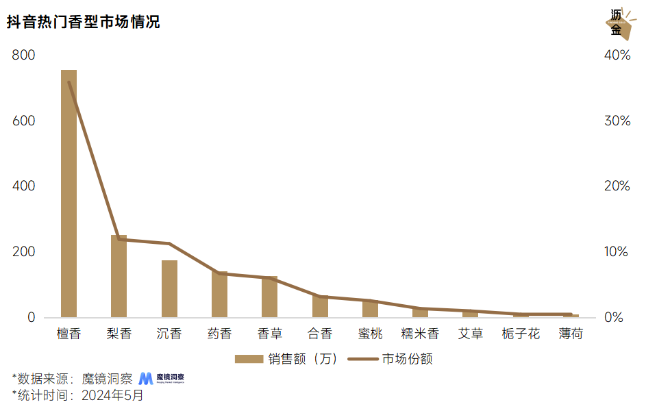 抖音的主流香型是梨香、檀香和沉香,占据2/3的市场规模,主打安神助眠、驱蚊除菌等功效;而紧随其后的桂花、蜜桃等花香则主打空气净化功效。