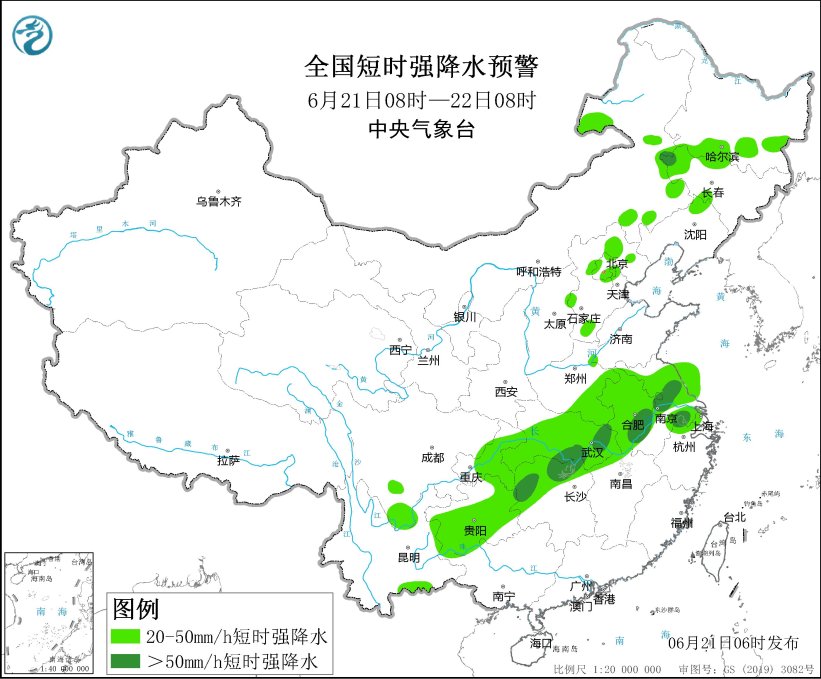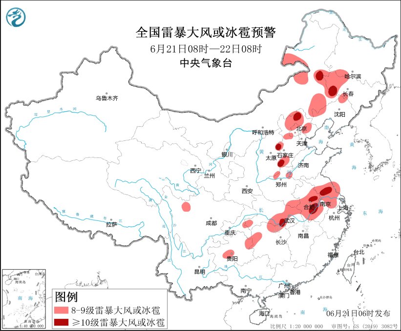 预计6月21日08时至22日08时,内蒙古东部、黑龙江西南部、吉林西部、辽宁西部、河北中北部和南部、北京西部和北部、天津北部、河南北部、安徽中南部、江苏中南部、湖北东部和南部、湖南北部、贵州东部和中部等地的部分地区将有8-10级雷暴大风或冰雹天气,其中,内蒙古东南部、河北北部和南部、安徽中南部、江苏中部、湖北南部等地的部分地区将有10级以上雷暴大风,最大风力可达11级以上;此外,内蒙古东部、黑龙江南部、吉林西部、辽宁西北部、河北中北部和南部、北京、天津北部、河南东部、安徽、江苏、上海、湖北、湖南西部和北部、浙江北部、重庆中东部、贵州等地的部分地区将有小时雨量大于20毫米的短时强降水天气,其中,吉林西部、安徽中南部、江苏中南部、湖北东部和南部、湖南北部和西部等地的部分地区的小时雨量将大于50毫米,最大可达80毫米以上。