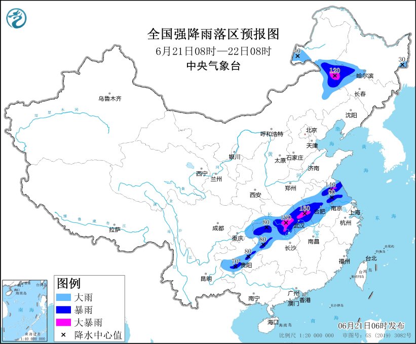预计,6月21日08时至22日08时,江淮大部、江汉大部、河南南部、湖南北部和西部、重庆东部、贵州西南部和中部以及内蒙古东北部、黑龙江西南部和东部、吉林西部等地部分地区有大到暴雨,其中,湖北东部和南部、安徽西部、江苏北部、内蒙古东北部、吉林西部等地局地有大暴雨(100~180毫米)。上述部分地区伴有短时强降水(最大小时降雨量30~60毫米,局地可超过80毫米),局地有雷暴大风等强对流天气。