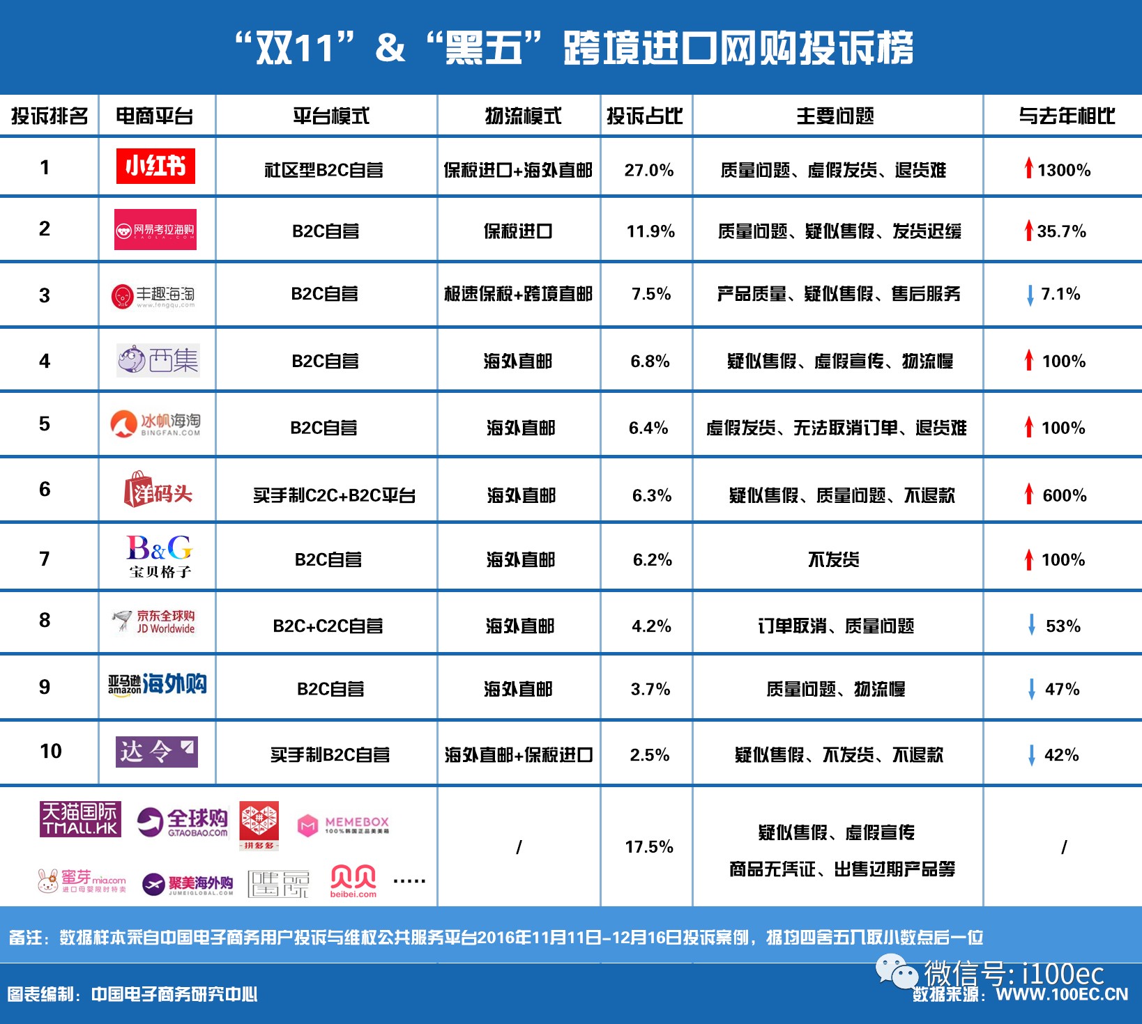 小红书、网易考拉海购、丰趣海淘、西集网、冰帆海淘、洋码头、宝贝格子、京东全球购、亚马逊海外购、达令为2016年“双11”、“黑五”后“十大热点被投诉跨境进口电商平台”。