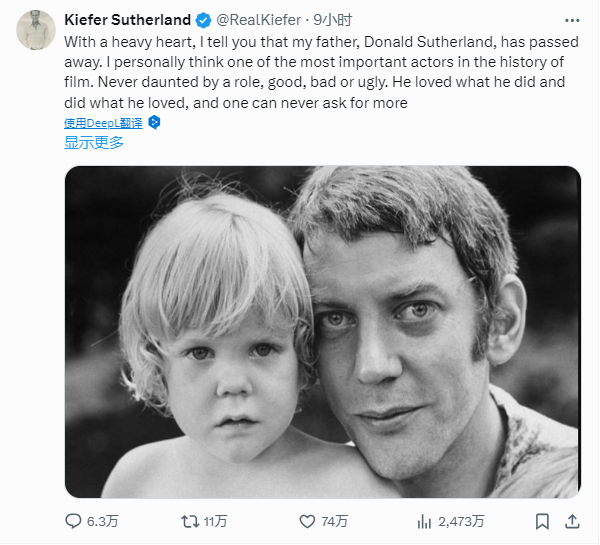 加拿大演员唐纳德·萨瑟兰当地时间6月20日去世,终年88岁。唐纳德·萨瑟兰的儿子基弗·萨瑟兰在社交媒体上确认了这一消息,基弗·萨瑟兰称父亲是电影史上最重要的演员之一。“他从不畏惧角色,不管是好角色、坏角色还是丑角色。他热爱自己的工作,做自己喜欢的事。”基弗·萨瑟兰说,父亲活出了精彩的一生。唐纳德·萨瑟兰曾经出演过冯小刚执导的影片《大腕》。此外,他还出演过《饥饿游戏》系列影片。