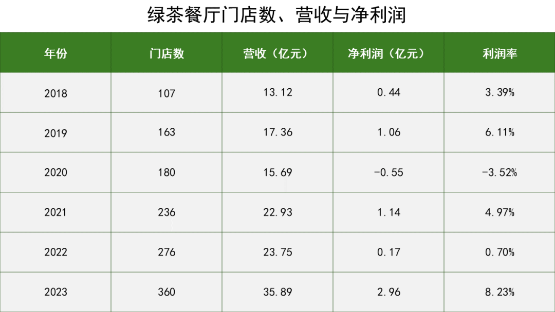 从财务数据来看,绿茶餐厅的营收从2018年的13.12亿元增长至2023年的35.89亿元,增加了173.56%。2023年实现了2.96亿元的净利润,利润率从3.39%提升到8.23%。