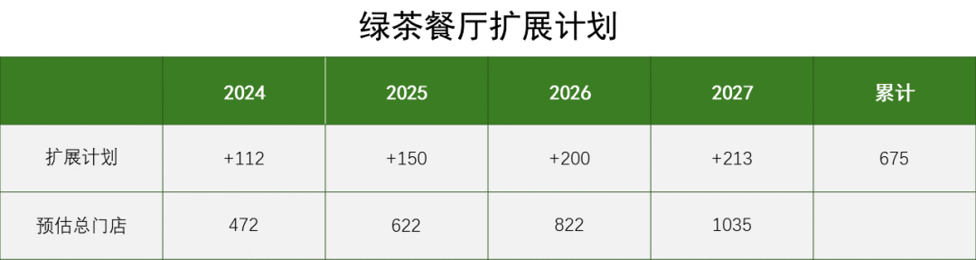 在门店拓展计划上,绿茶餐厅计划于2024至2027年共开出675家门店。这意味着绿茶餐厅或将在2027年达到千店规模。(不考虑关店)。