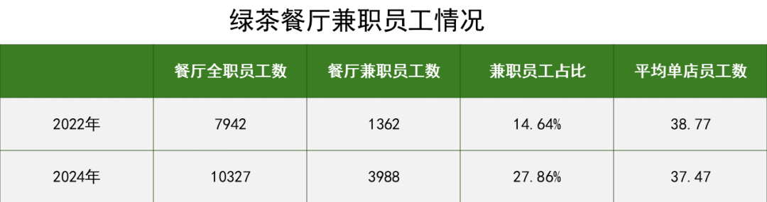 绿茶餐厅也通过雇佣兼职的方式压缩员工成本上涨。对比最近两次招股书最后实际可行日期的雇员情况,其全职餐厅员工从7942名增加到10327名,但是单店平均的全职员工,从33.09人下降到27.03人。餐厅的兼职雇员占比从14.64%上升到27.86%。