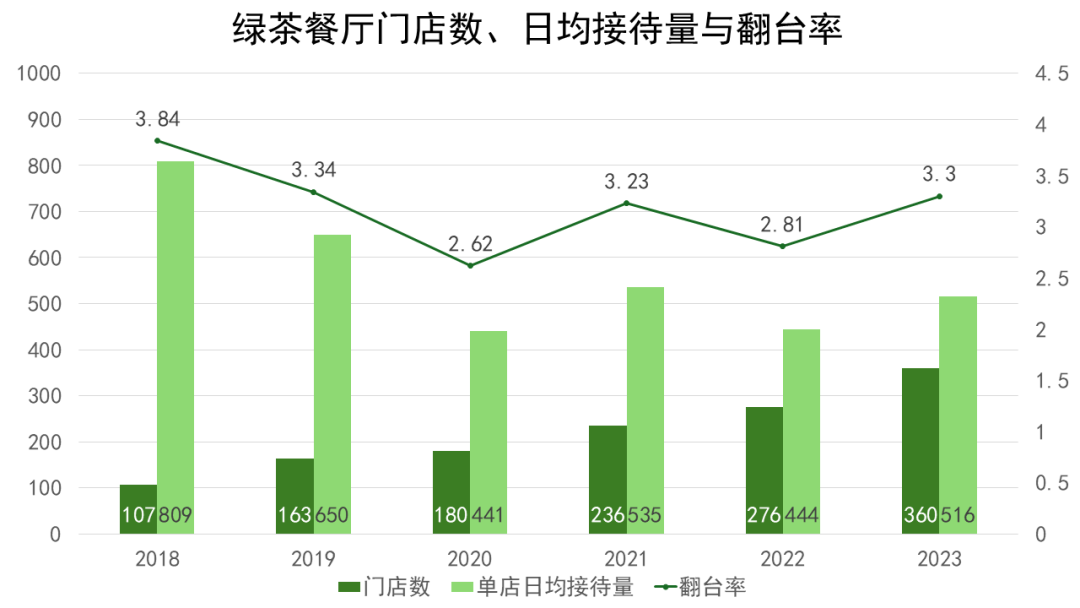 对比2018年和2023年的数据,绿茶餐厅的门店数量增加了2.36倍,而单店日均接待量仅下降了36%。相比一间能接待809个人的餐厅,三间能接待516个人的餐厅在分散客流和提升品牌覆盖面方面显然更具优势。