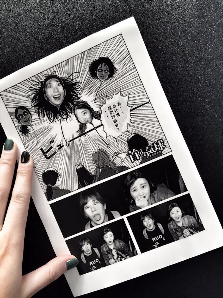 展览分好几个部分,最开始的是AR互动专区。观展者在入场前需要提前下载好“伊藤润二AR”的手机APP, 入场后会获发AR眼镜。打开APP并将手机放入AR眼镜后,观看该专区展出的漫画就会看到伊藤润儿笔下的恐怖人物立马会动起来。无数个富江冲出画面伸出手仿佛即将要把人拉入深渊,不禁让人毛骨悚然。之后接着还有《富江》专区与伊藤润二创作生涯专区。在展览最后设立了一个“人头气球恐怖拍照亭”的互动体验区,观展者进入拍照亭任意摆出恐怖的表情,即可制作十分有收藏价值的个人定制《人头气球》漫画专页。
