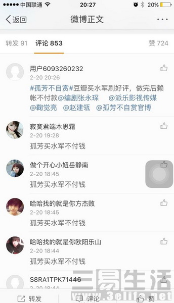 对于水军“讨债”的评论,《孤芳》出品方负责人表示并没有买过水军,不清楚官博下的评论是怎么回事。然而,这种解释在业内人看来多少有点站不住脚。一位不愿具名的业内人士曾透露,“水军”的结算方式并非提前预付全部款项,有可能会出现阶段性付款。这次“水军”在网络讨薪,多半是因为 “水军”方面迟迟收不到尾款,才公然走到前台来讨薪。