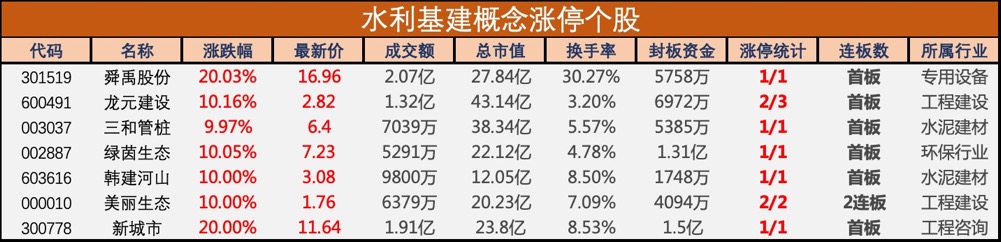 今天,水利基建板集体上涨,截至发稿,舜禹股份、新城市20cm封板,美丽生态、绿茵生态、龙元建设等多股涨停。