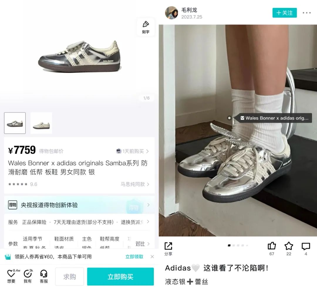 热度最高的adidas Samba,欧美明星、韩国K-POP爱豆、国内穿搭博主几乎人手一双,引发追同款的潮流,比如Blackpink的成员Jennie就带火了不少Samba;与Wales Bonner的联名虽然看起来小众,实则在潮流圈认可度很高,“小银鞋”在得物已经被炒到了7千多。