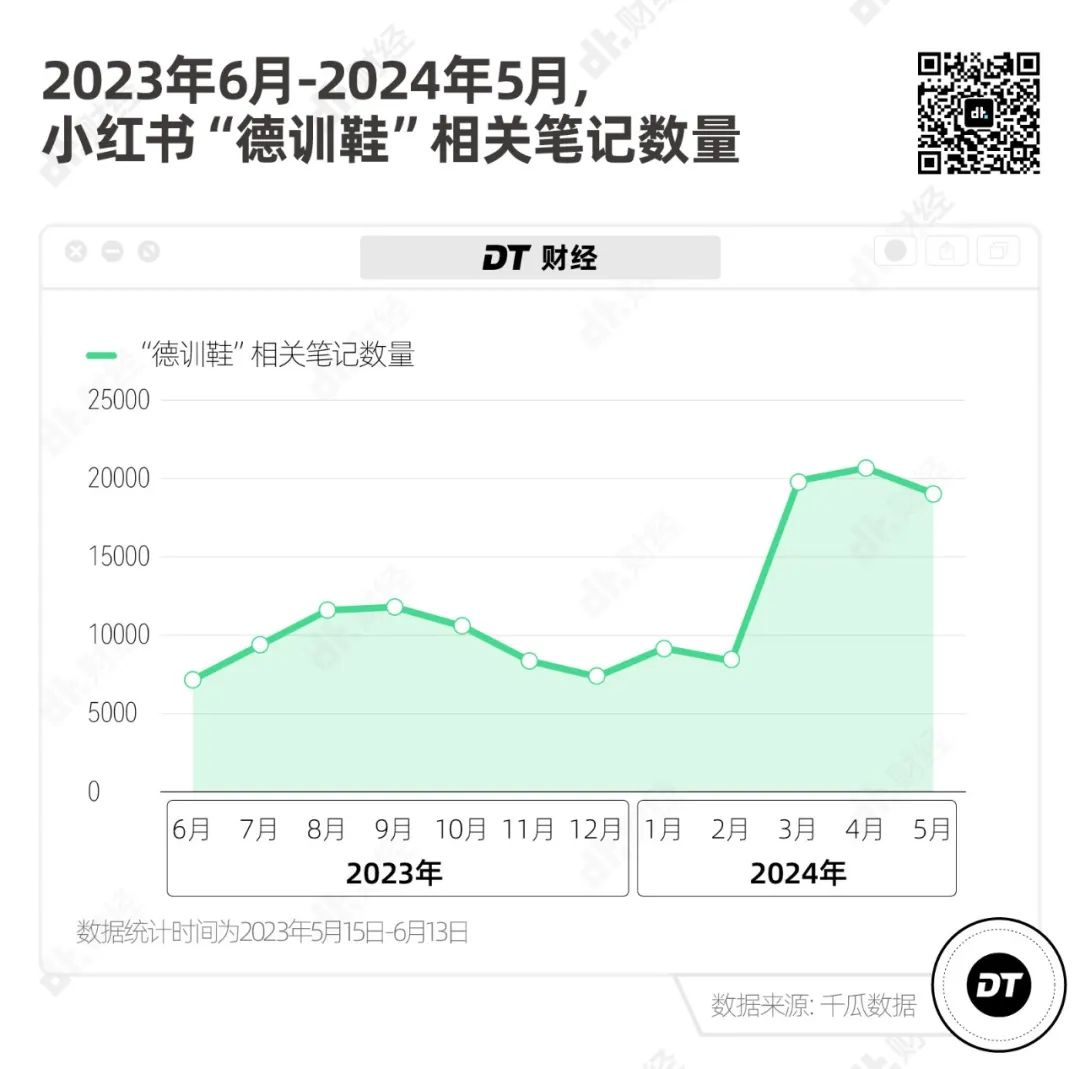 近一年来,“德训鞋”在小红书上的相关内容持续受到关注,最近三个月的热度更是明显升高,单月相关笔记数量都在2万篇左右。
