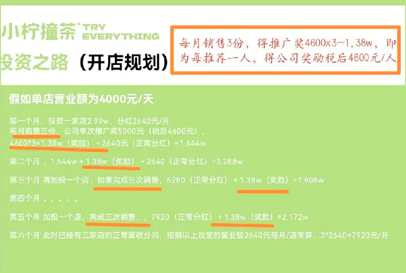 按照小柠撞茶的招商逻辑,投资者若能在两个月内发展六名新投资者,结合正常分红与推荐奖励,便能快速回收投资成本。