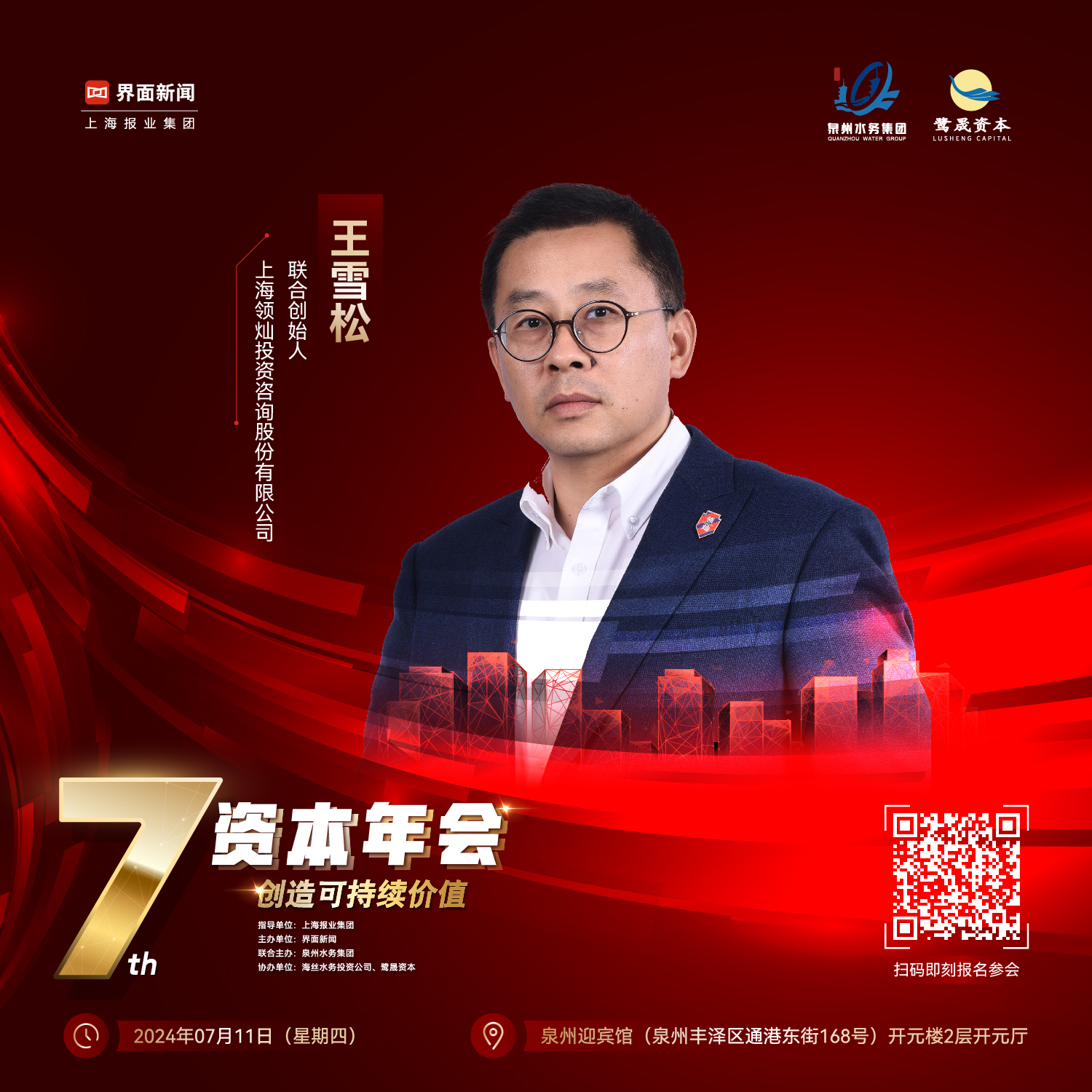 由上海报业集团作为指导单位,界面新闻主办、泉州水务集团有限公司联合主办,泉州海丝水务投资有限责任公司、泉州鹭晟私募基金管理有限公司作为协办单位 【2024资本年会】确认将于7月11日(星期四)在泉州迎宾馆(泉州丰泽区通港东街168号)举行。(点击“2024资本年会”即刻锁定年会参会名额)