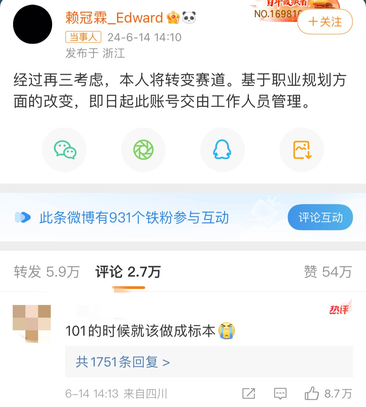 这是赖冠霖发布“将转换赛道,账号交由工作人员管理”的微博后,点赞最多的一条评论。
