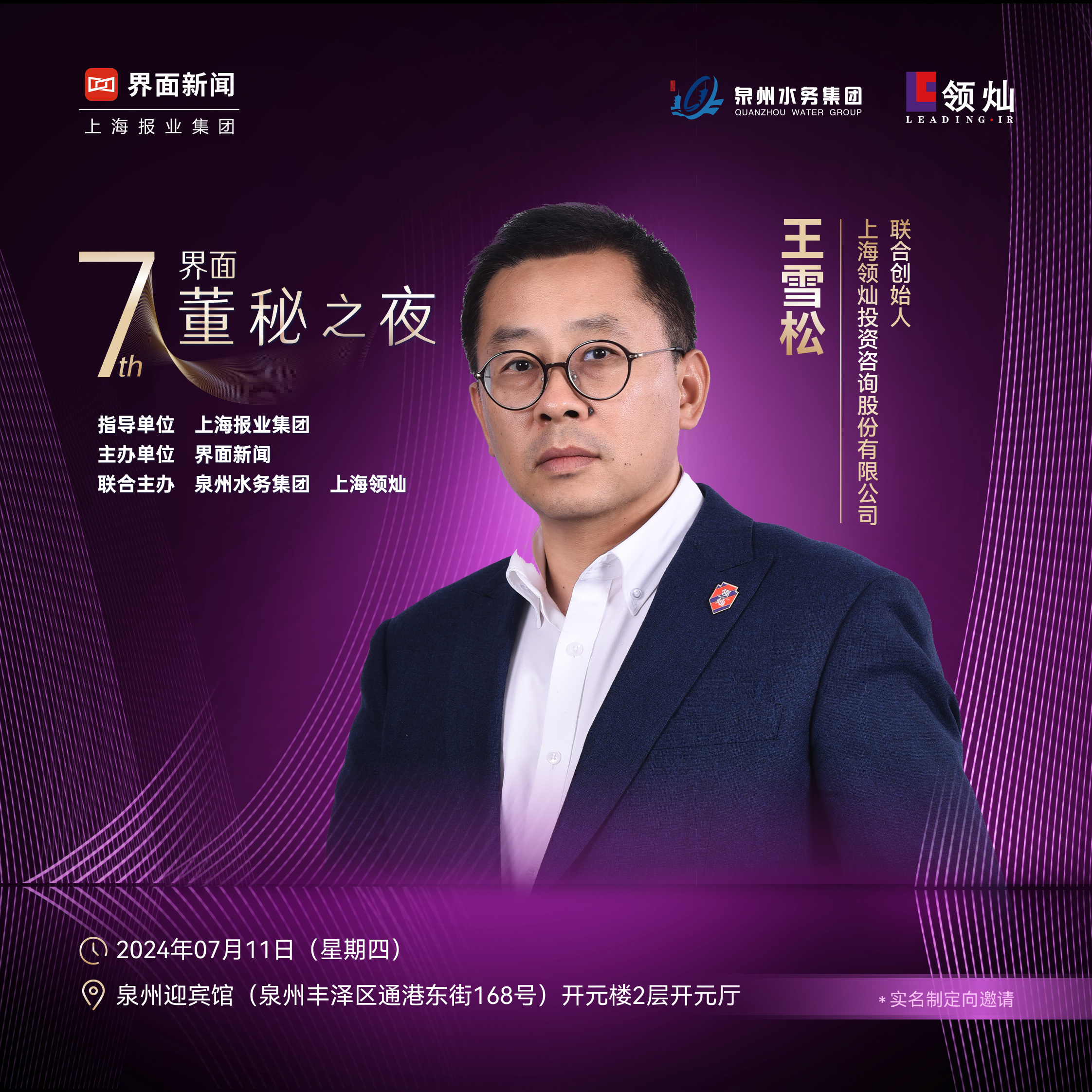 由上海报业集团作为指导单位,界面新闻主办、泉州水务集团有限公司、上海领灿联合主办的【2024董秘之夜】将于7月11日(星期四)在泉州迎宾馆(泉州丰泽区通港东街168号)举行。晚宴将展现资本市场蓬勃向上的坚韧力量。在回望过去,展望未来的同时,也以此不断激励资本市场的所有参与者向着可持续、高质量的未来一路高歌猛进。