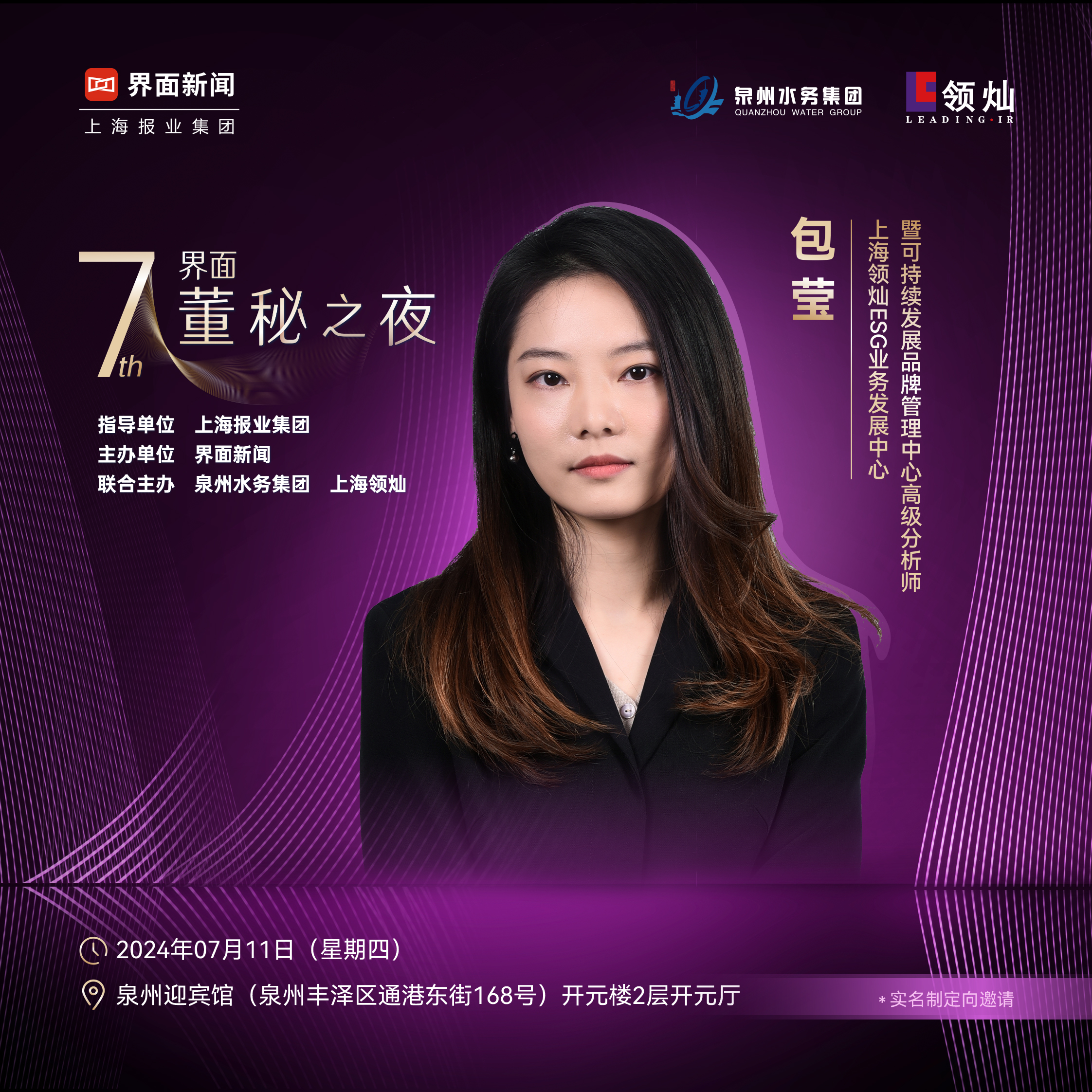 上海领灿ESG业务发展中心暨可持续发展品牌管理中心高级分析师包莹确认出席【2024董秘之夜】。与此同时,晚宴现场,联合主办方泉州水务集团有限公司、上海领灿也将带来精彩纷呈的专业分享、解读。