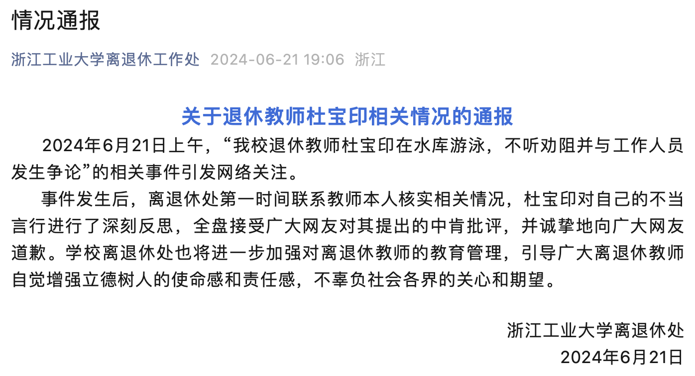 近日,网友发视频称,村巡查队在饮用水备用水库发现一男子在水库游泳,劝阻时对方称“我要亮出身份你就会吓死”“农业农村厅的XX是我的朋友”等话语引关注。该视频发布者称,该男子自称系浙江工业大学教授杜某印。6月21日,浙江工业大学离退休处发布通报称,“我校退休教师杜宝印在水库游泳,不听劝阻并与工作人员发生争论”的相关事件引发网络关注。事件发生后,离退休处第一时间联系教师本人核实相关情况,杜宝印对自己的不当言行进行了深刻反思,全盘接受广大网友对其提出的中肯批评,并诚挚地向广大网友道歉。学校离退休处也将进一步加强对离退休教师的教育管理,引导广大离退休教师自觉增强立德树人的使命感和责任感,不辜负社会各界的关心和期望。